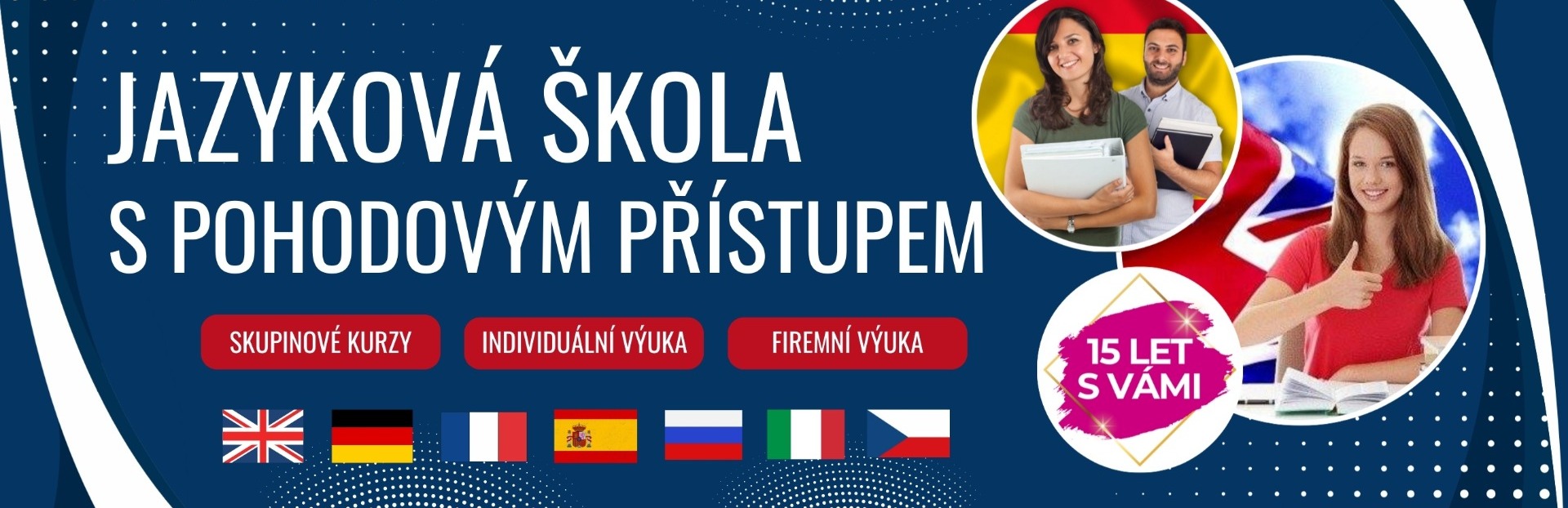 U nás můžete studovat jakýkoli jazyk z naší nabídky níže, a to buď prezenční ( v našich učebnách, v Benešově ) nebo on-line formou, přímo z pohodlí vašeho domova nebo kanceláře. Obsahová náplň vašeho studia je vždy přizpůsobena požadavkům studenta. Díky naším bohatým a dlouholetým zkušenostem s jazykovou výukou dokážeme naučit cizí jazyk každého, i toho největšího "antitalenta"! Nevěříte nebo máte pocit, že vy se snad nikdy jazyk nenaučíte? Tak to pojďte zkusit pro změnu k nám a rozdíl brzy uvidíte sami! Garantujeme vám, že na naše hodiny se budete vždy těšit a rozhodně se nudit nebudete, naopak se budete divit, že hodina je již za vámi!