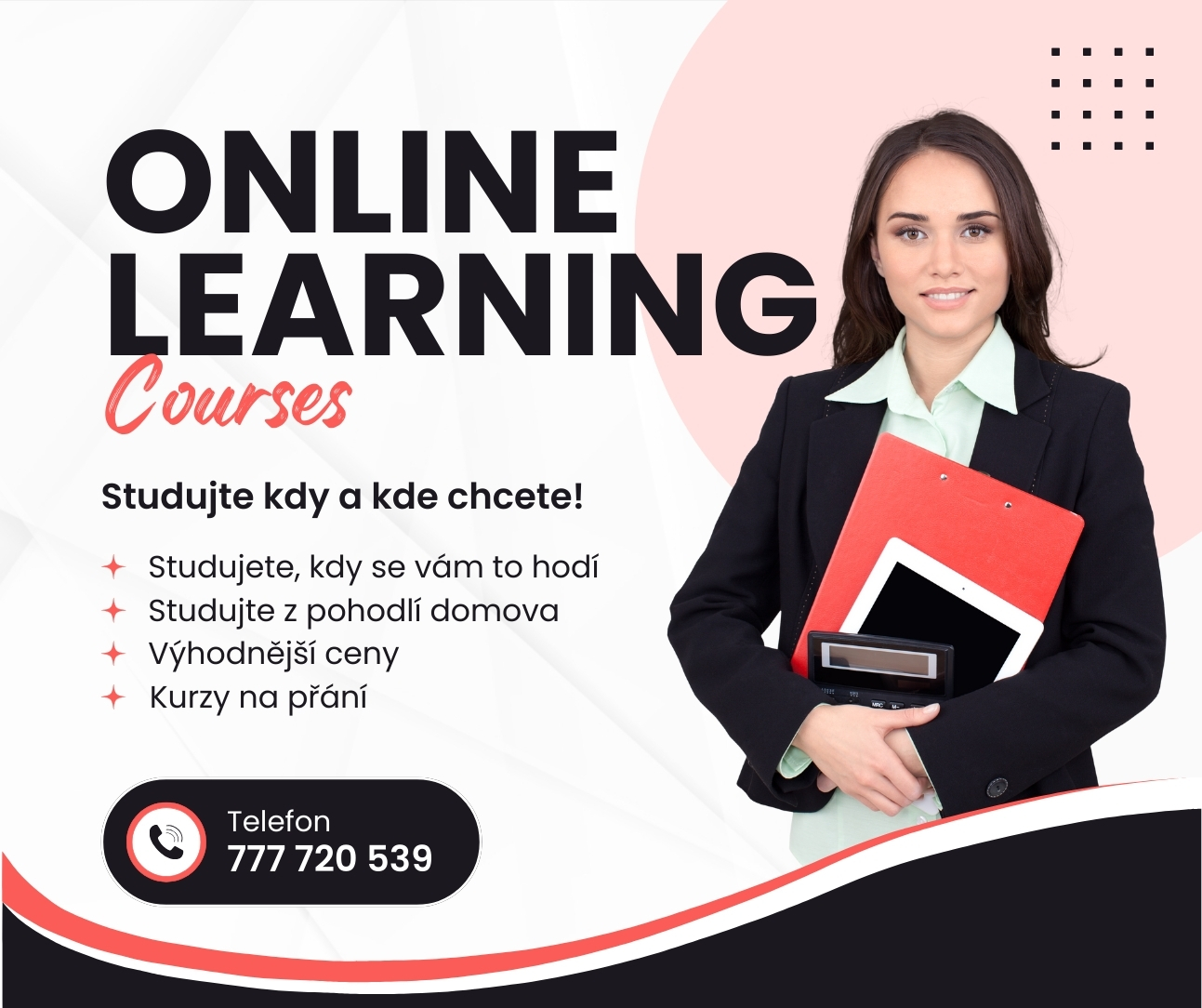E-learningovým kurzům se můžete věnovat kdykoli a kdekoli chcete, např. z pohodlí svého domova, kanceláře, na služebních cestách, na dovolené apod. Sedněte si k počítači, vezměte svůj mobil nebo tablet a pusťte se do toho, kdykoli můžete nebo máte chuť! Nejlepší, co můžete mít, je možnost studovat tehdy, když máte chuť, dostatek času a zároveň energie - potom vám to půjde samo!