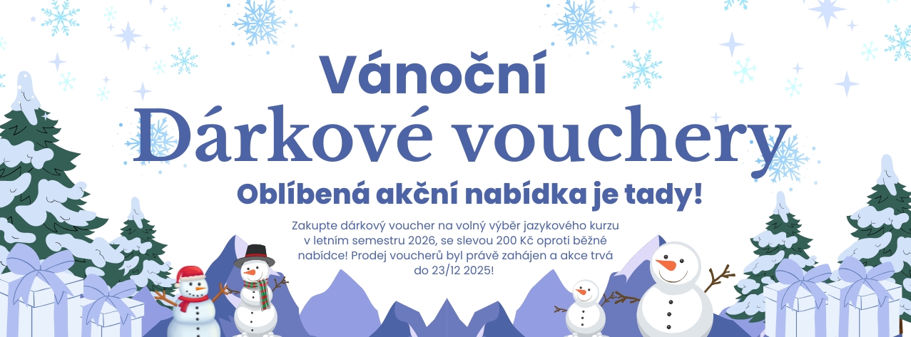 Touží někdo z vašich blízkých po studiu cizího jazyka a vy byste mu chtěli toto přání pod vánočním stromečkem splnit? Pak neváhejte a zakupte mu náš zvýhodněný vánoční voucher na volný výběr jazykového kurzu z naší aktuální nabídky na letní semestr 2026! Poté si obdarovaný vybere vhodný kurz sám nebo mu s výběrem toho pravého kurzu pomůžeme my. Pokud obdarovaný již daný jazyk studoval, může si u nás zdarma vypracovat vstupní test a podle výsledku mu rádi doporučíme co nejvhodnější kurz.